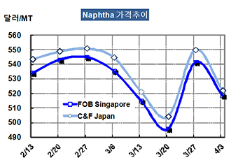 나프타 가격은 4월3일 CFR Japan 톤당 522달러로 28달러 급락했다.