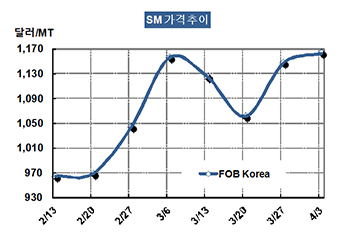 SM 가격은 4월3일 FOB Korea 톤당 1163달러로 15달러 상승했다.