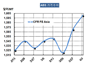 ABS 가격은 4월1일 CFR China 톤당 1600달러로 30달러 급등했다.
