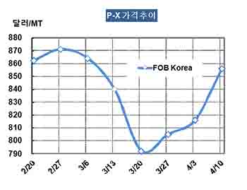 P-X 가격은 4월10일 FOB Korea 톤당 856달러로 40달러 급등했다.