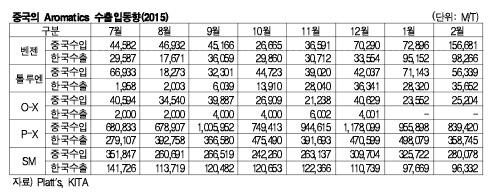 표, 그래프: < 중국의 Aromatics 수출입동향(2015) > <화학저널 2015/04/16> |