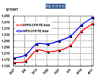 GPPS 가격은 4월15일 CFR China 톤당 1400달러로 50달러 폭등했다.