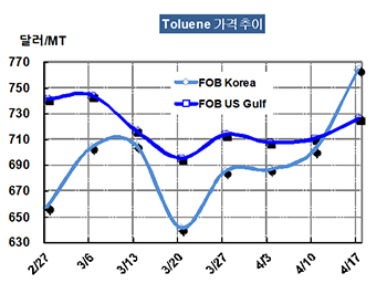 톨루엔 가격은 4월17일 FOB Korea 톤당 764달러로 62달러 폭등했다.