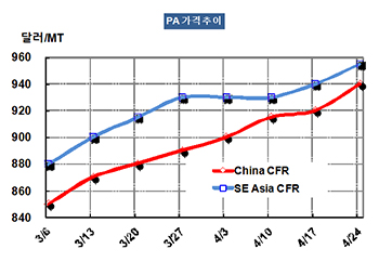 PA가 4월23일 CFR China 톤당 940달러로 20달러 상승했다.