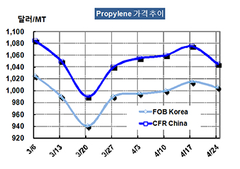 프로필렌 가격은 4월24일 FOB Korea 톤당 1005달러로 10달러 하락했다.