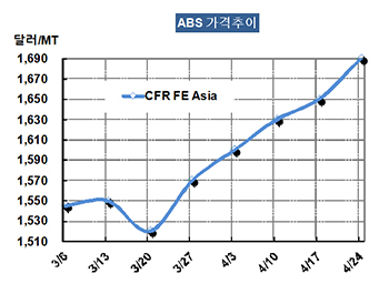 ABS 가격은 4월22일 CFR China 톤당 1690달러로 40달러 폭등했다.
