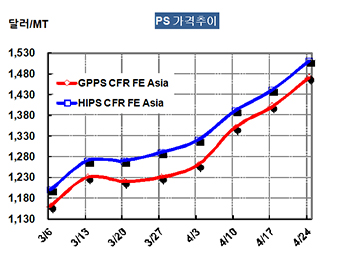 GPPS 가격은 4월22일 CFR China 톤당 1470달러로 70달러 폭등했다.