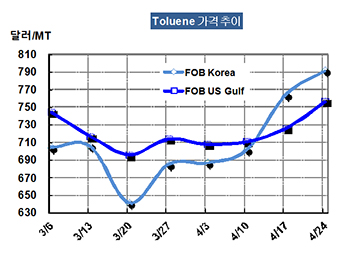 톨루엔 가격은 4월24일 FOB Korea 톤당 791달러로 27달러 상승했다.