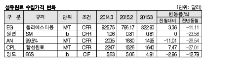 표, 그래프: < 섬유원료 수입가격 변화 > <화학저널 2015/04/29> |