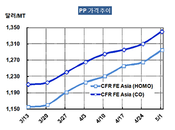 PP 가격은 4월29일 CFR FE Asia 톤당 1295달러로 25달러 급등했다.