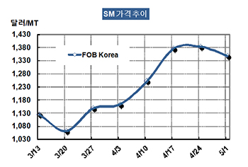 SM 가격은 5월1일 FOB Korea 톤당 1348달러로 36달러 급락했다.