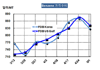 벤젠 가격은 5월1일 FOB Korea 톤당 827달러로 44달러 급락했다.