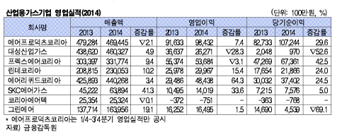 표, 그래프: < 산업용가스기업 영업실적(2014) > <화학저널 2015/05/07> |