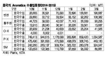 표, 그래프: < 중국의 Aromatics 수출입동향(2014-2015) > <화학저널 2015/05/08> |