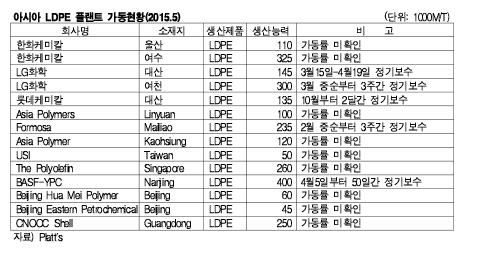 표, 그래프: < 아시아 LDPE 플랜트 가동현황(2015.5) > <화학저널 2015/05/11> |