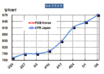 O-X 가격은 5월8일 FOB Korea 톤당 970달러로 33달러 급등했다.