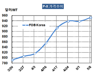 P-X 가격은 5월8일 FOB Korea 톤당 952달러로 14달러 상승했다.