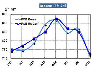 벤젠 가격은 5월15일 FOB Korea 톤당 751달러로 89달러 폭락했다.