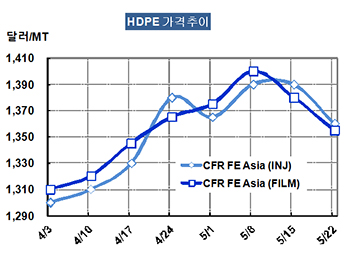 HDPE 가격은 5월20일 CFR FE Asia 톤당 1360달러로 30달러 급락했다.