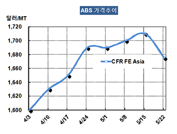 ABS 가격은 5월20일 CFR China 톤당 1675달러로 35달러 폭락했다.