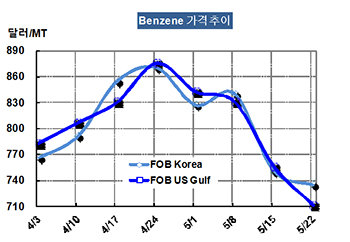 벤젠 가격은 5월22일 FOB Korea 톤당 735달러로 15달러 하락했다.