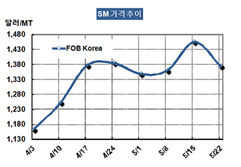 SM 가격은 5월22일 FOB Korea 톤당 1374달러로 81달러 폭락했다.