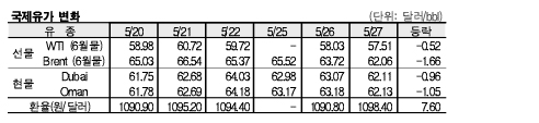5월27일 국제유가는 공급과잉 지속 전망 및 미국의 원유 재고 증가 등으로 하락했다.