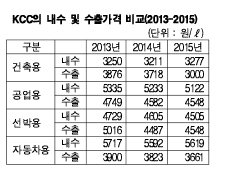 수지와 용제는 페인트 원료의 40% 가량을 차지해 국제유가 하락을 타고 석유제품 가격하락으로 이어지면서 페인트도 수혜를 입고 있다. 특히, 석유화학기업들은 적자에 허덕였으나 페인트 메이저들은 영업이익률이 개선됐다. 페인트 생산기업들이 2014년 1/4분기에 비해 용제는 10%, 수지는 15% 가량 낮은 가격에 구매했기 때문으로 판단된다. 원료가격 스프레드 개선에도 불구하고 페인트 판매가격은 대체로 내려가지 않았고 심지어 오른 품목도 존재하고 있기 때문이다. KCC는 도료부문의 2015년 1/4분기 영업이익이 444억원으로 2014년 1/4분기 365억원에 비해 17% 증가했고, 영업이익률은 9.5%에서 11.45%로 상승했다. ![]() 노루페인트는 2015년 1/4분기 영업이익이 50억원으로 47% 증가했고, 시장점유율이 상승하며 영업이익률도 5%를 나타냈다. 건설화업은 시장점유율 축소로 매출은 줄었으나 영업이익은 그대로 유지했고, 삼화페인트는 두드러지지는 않으나 안정적인 영업이익과 매출액을 이어나가고 있다. 하지만, 영업이익 증가는 내수와 수출 가격 차이의 가능성이 존재하고 있다. KCC는 2008년 이후 도료에 대한 수출 우대정책 축소로 고품질 판매전략 및 내수 시장 확대전략을 펼치고 있다. 페인트 시장은 용도에 따라 다르지만 국내가격이 수출가격보다 높고 리터당 가격 차이가 큰 항목은 2000원에 달하는 것으로 나타나고 있다. 표, 그래프: < KCC의 내수 및 수출가격 비교(2013-2015) > <화학저널 2015/06/03> |
