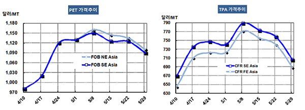 한편, 아시아 PET 시장은 MEG와 PTA 가격 하락으로 5월27일 톤당 35달러씩 떨어져 FOB NE Asia 1100달러, FOB SE Asia 1090달러를 형성했다.