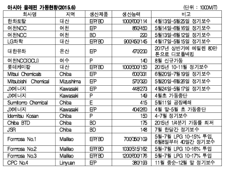 표, 그래프: < 아시아 올레핀 가동현황(2015.6) > <화학저널 2015/06/05> |