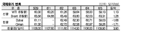 6월5일 59.03달러로 1.68달러 폭락 … 브렌트유는 63.31달러로 급등