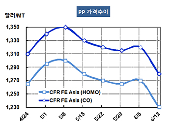 표, 그래프: < PP 가격추이 > <화학저널 2015/06/16> |