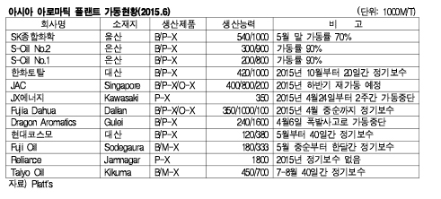 표, 그래프: < 아시아 아로마틱 플랜트 가동현황(2015.6) > <화학저널 2015/06/17> |
