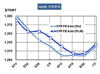 표, 그래프: < HDPE 가격추이 > <화학저널 2015/07/06> |