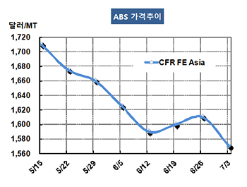 표, 그래프: < ABS 가격추이 > <화학저널 2015/07/08> |