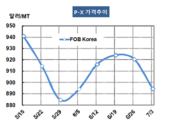 P-X(Para-Xylene) 시장은 다운스트림 침체 영향이 가시화되고 있다. P-X 가격은 7월3일 FOB Korea 톤당 895달러로 26달러 하락했고 CFR SE Asia는 913달러를 형성했다. 표, 그래프: < P-X 가격추이 > <화학저널 2015/07/09> |