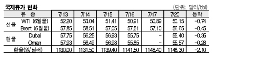 7월20일 국제유가는 이란의 공급 증가 전망 및 사우디의 석유제품 수출 증가 영향으로 하락했다.