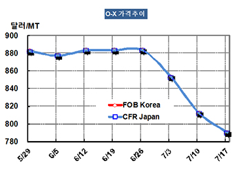표, 그래프: < O-X 가격추이 > <화학저널 2015/07/24> |