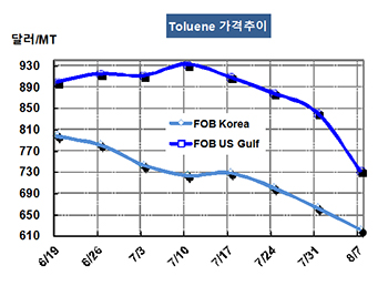 톨루엔(Toluene) 시세는 600달러대 초반으로 미끄러졌다.