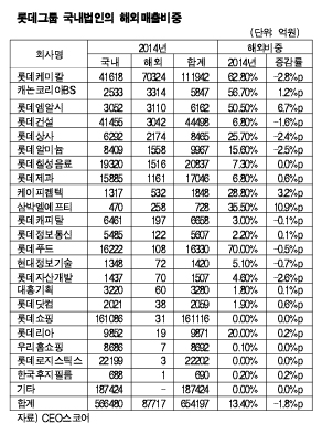 롯데그룹은 2014년 해외매출이 1조원 넘게 격감한 가운데 감소 매출액 대부분이 롯데케미칼의 부진에 따른 것으로 나타났다.