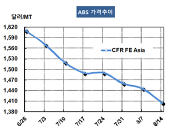 ABS 가격은 8월12일 CFR China 톤당 1405달러로 40달러 폭락했고 CFR SE Asia 역시 1400달러로 40달러 떨어졌다.