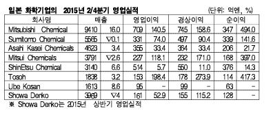 일본 화학 메이저 7사는 시황호조 및 엔저에 힘입어 2/4분기 영업실적이 대폭 확대된 것으로 나타났다. 표, 그래프: < 일본 화학기업의 2015년 2/4분기 영업실적 > <화학저널 2015/08/21> |