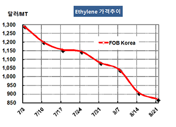 에틸렌(Ethylene) 시세는 900달러마저 버티지 못하고 무너졌다. 에틸렌 가격은 8월21일 FOB Korea 톤당 870달러로 39달러 급락했고 CFR SE Asia는 886달러를 형성했다. 표, 그래프: < Ethylene 가격추이 > <화학저널 2015/08/24> |
