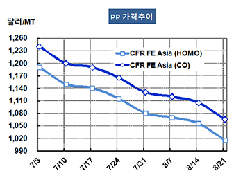 PP(Polypropylene) 시세는 폭락을 거듭해 시장붕괴가 가속화되고 있다. PP 가격은 8월19일 Raffia 및 Injection 그레이드 기준 CFR FE Asia 1015달러로 40달러 폭락했고 CFR SE Asia도 1025달러로 55달러 폭락했다. 특히, CFR S Asia는 1035달러로 60달러 떨어졌다. 표, 그래프: < PP 가격추이 > <화학저널 2015/08/25> |