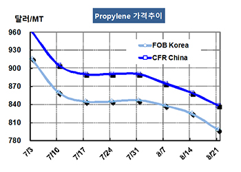 프로필렌(Propylene) 시세는 800달러마저 힘없이 무너졌다. 프로필렌 가격은 8월21일 FOB Korea 톤당 798달러로 27달러 급락했고 CFR SE Asia는 783달러를 형성했다. CFR SEA는 FOB Korea에 비해서도 15달러 낮은 수준을 형성해 전체적으로 동남아시아 시장 침체가 심각한 것으로 평가되고 있다. 표, 그래프: < Propylene 가격추이 > <화학저널 2015/08/25> |