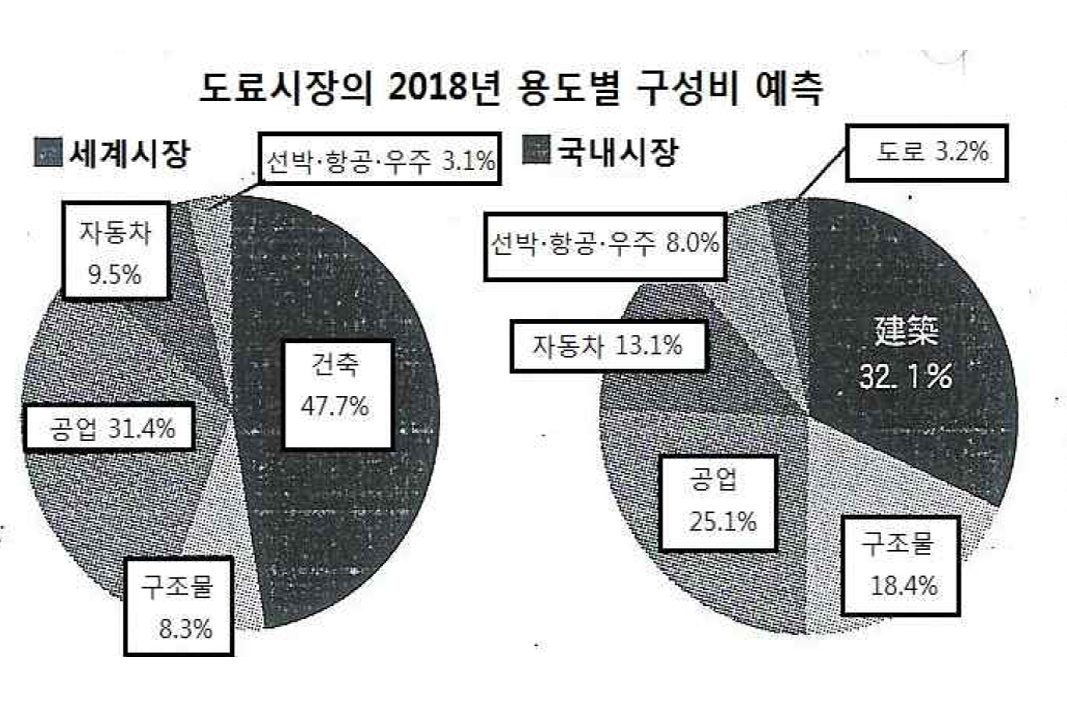 2018년 세계 도료 시장은 13조2092억엔으로 2014년에 비해 20% 증가하고 건축용이 약 50%, 공업용이 약 30%, 자동차용이 약 10%를 차지할 것으로 예상된다.