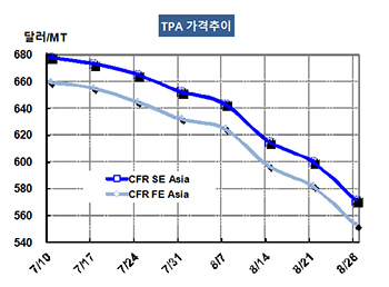PTA(Purified Terephthalic Acid) 시세는 역외물량 유입으로 하락했다. 아시아 시장에서 9월 PTA, 10월 MEG(Monethylene Glycol) 선물가격이 호전됐지만 달러화 베이스 현물 유입이 하락 압박으로 작용했다. 표, 그래프: < TPA 가격추이 > <화학저널 2015/09/03> |