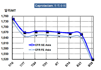 아시아 CPL(Caprolactam) 시세는 폭락세로 전환돼 6년만에 가장 낮은 수준을 형성했다.