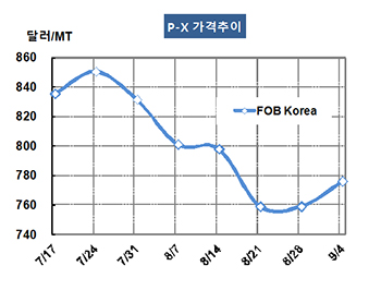 P-X(Para-Xylene) 시세는 폴리에스터 침체에도 불구하고 상승세로 전환됐다. P-X 가격은 9월4일 FOB Korea 톤당 776달러로 17달러 상승했고 CFR SE Asia는 797달러를 형성했다. 표, 그래프: < P-X 가격추이 > <화학저널 2015/09/10> |