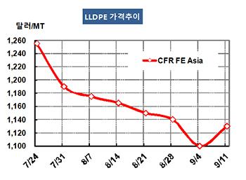 LLDPE(Linear Low-Density Polyethylene) 시세는 지나치게 떨어졌다고 판단해 급등했다. LLDPE 가격은 9월9일 CFR FE Asia 톤당 1130달러로 30달러 급등했고 CFR SE Asia는 1150달러, CFR S Asia는 1180달러로 각각 50달러 폭등했다. 표, 그래프: < LLDPE 가격추이 > <화학저널 2015/09/14> |